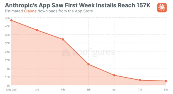 根据应用程序情报公司Appfigures的数据,Claude在美国的苹果免费iPhone应用程序排行榜上的最高排名——是5月4日取得的第55位,也就是5月1日上线后的第四天。但截至上周五,该应用已不再跻身于iPhone美区的免费App榜单之列。