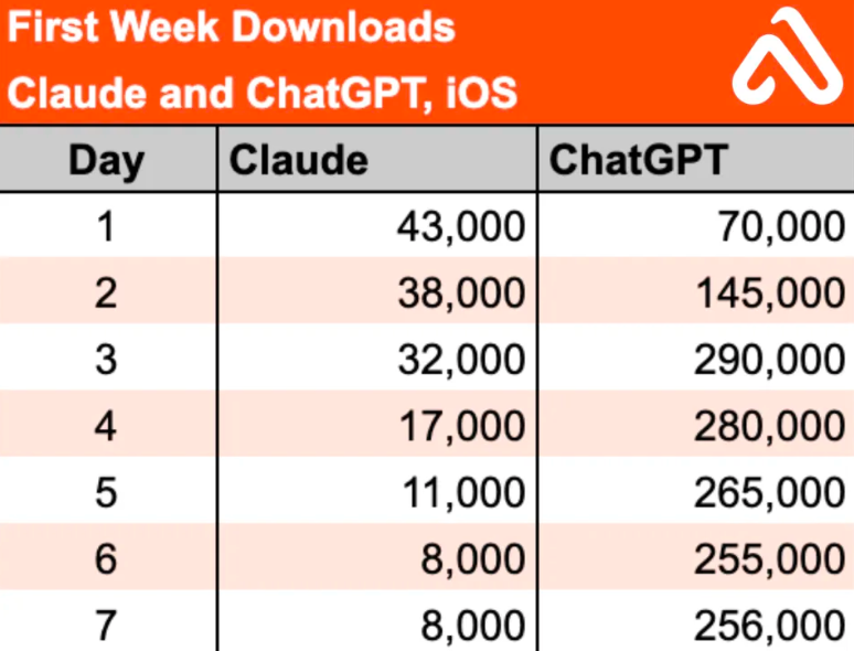 而很明显的是,在Claude App推出后,人们对这款新AI应用的兴趣出现了急剧下降——下载量在推出后一周内迅速从单日的五位数下降到四位数。这种下降表明,消费者对这款ChatGPT的竞品,可能并没有同样高的需求或品牌认知度。