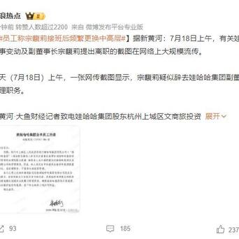 #员工称宗馥莉接班后频繁更换中高层#7月18日,宗庆后之女宗馥莉辞任娃哈哈副董事长的函件在网上流传,引发市场高度关注。